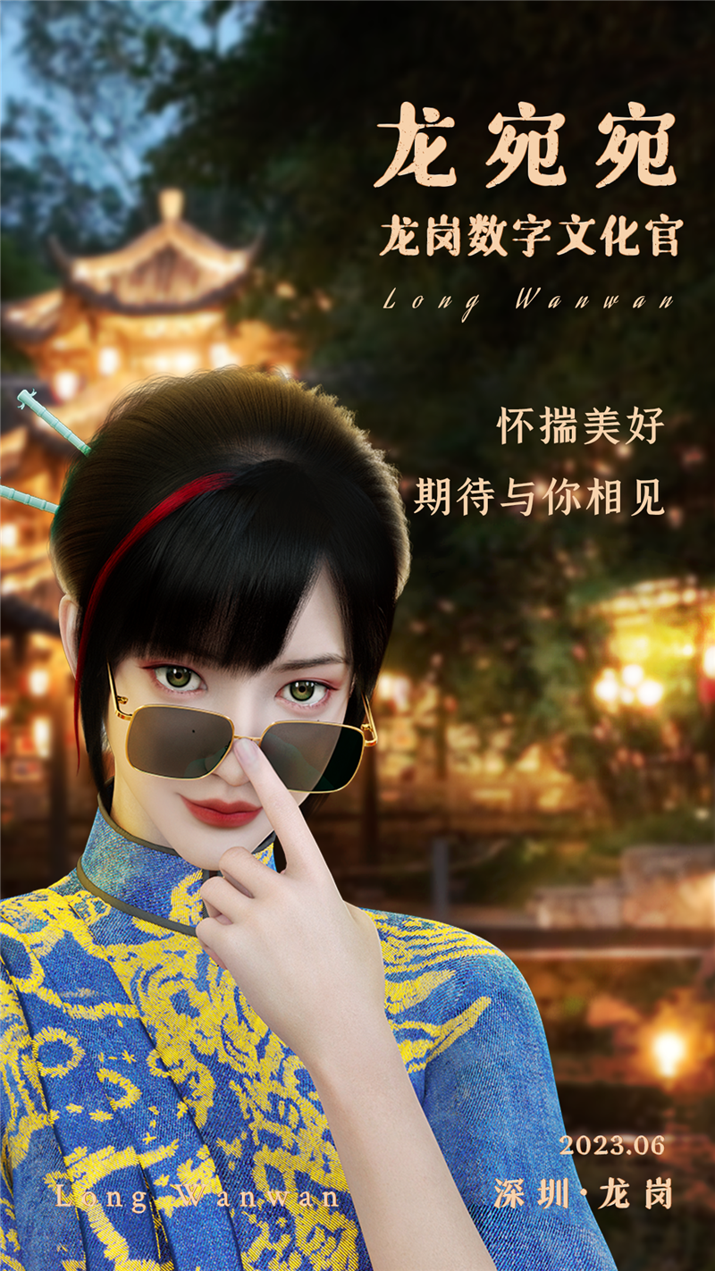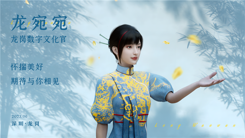 深圳新闻网2023年6月7日讯(记者 李云云 通讯员 叶创坚)为余驾飞龙兮,杂瑶象以为车。留着中式盘发,身穿点缀着龙岗非遗文化麒麟舞元素的蓝裙,黑漆皮高跟长靴,双手交叉后背,面容姣好、目光和煦,侧身而立,飒爽干练、身姿靓丽,“她”来了!第十九届文博会期间,龙岗区官宣了一则最新的“人事任命”数字文化官——龙宛宛。