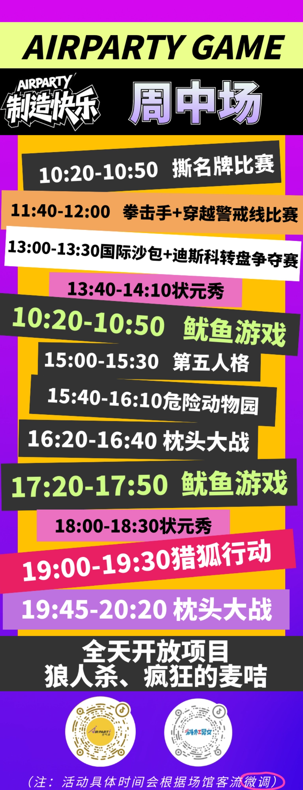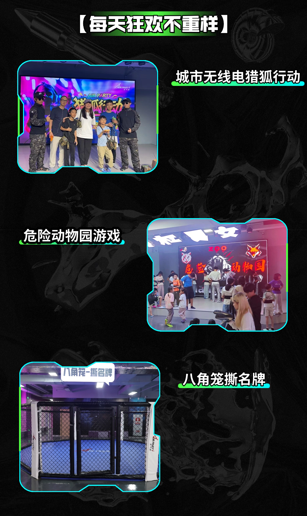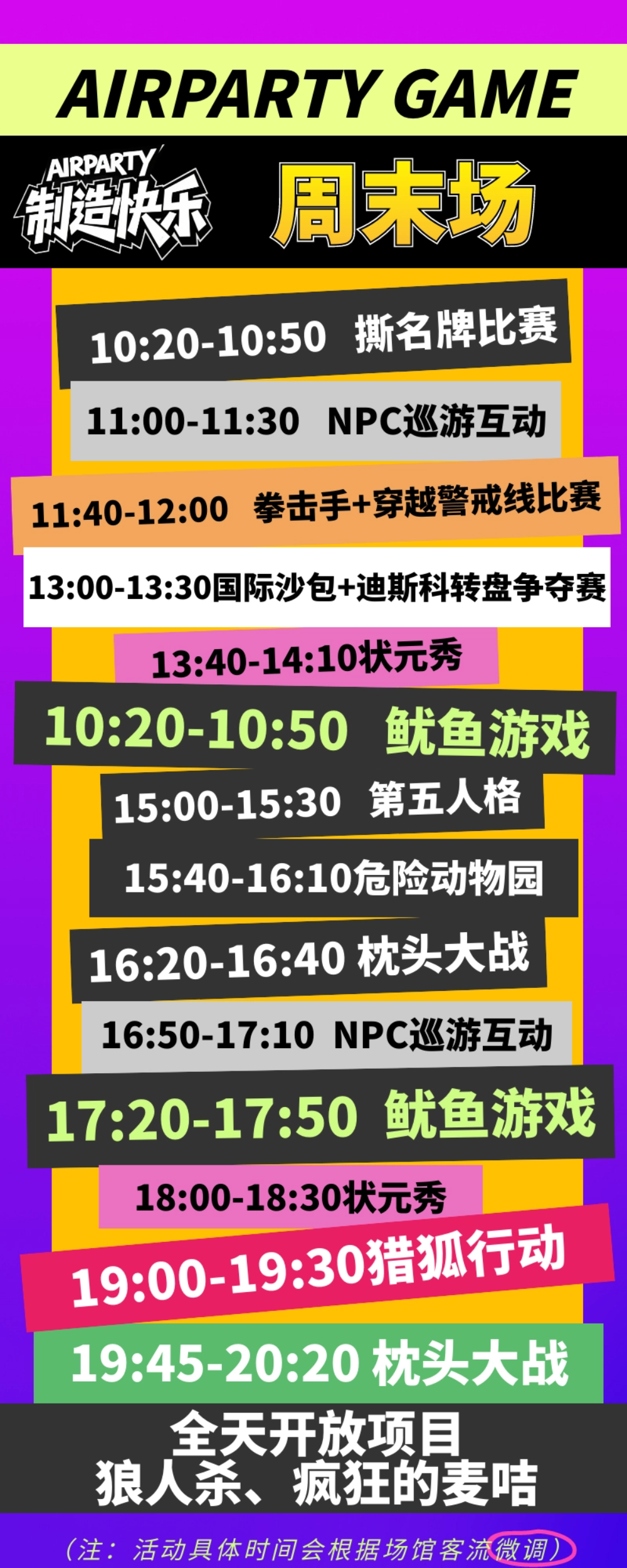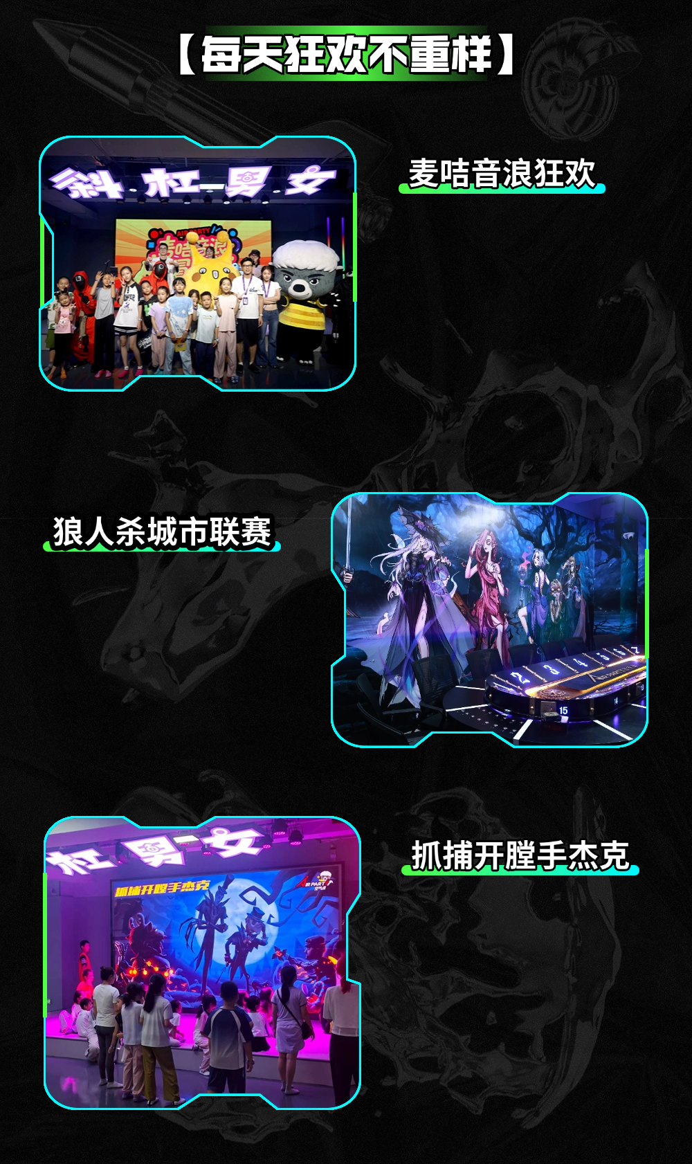 为提升体验感,场馆每日安排不同主题的狂欢活动。周中(周一至周五)10:20至20:20,撕名牌比赛、拳击手与穿越警戒线比赛、国际沙包与迪斯科转盘争夺赛、状元秀、鱿鱼游戏、第五人格、危险动物园、枕头大战、猎狐行动等活动轮番上演,狼人杀、疯狂的麦咭等项目全天开放。周末则在周中活动基础上增加NPC巡游互动,进一步烘托欢乐氛围,活动具体时间将根据客流情况微调。