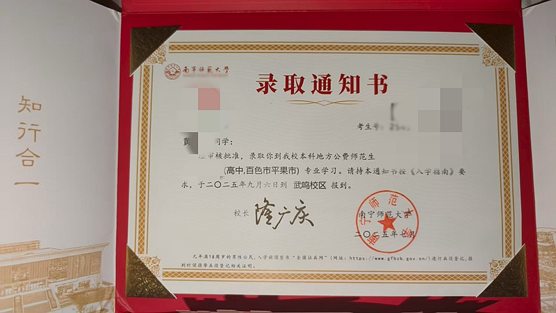 深圳新闻网2025年9月8日讯(记者 张凡 通讯员 黎娜)一封录取通知书,承载着一个学子的梦想,也见证了一段跨越山海的深情守望。近日,广西那坡县百省乡孤儿黄同学以高考562分的成绩被南宁师范大学录取,她的求学之路背后,是一场由深圳龙岗医疗帮扶团队发起、社会各界接力参与的温暖行动。