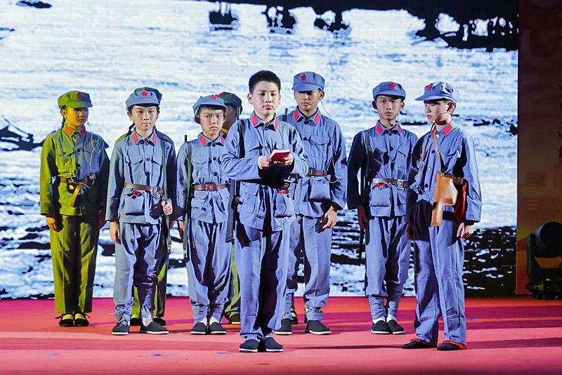 以龙岗本土红色故事为原型创作的情景剧《烽火少年》,更让观众穿越时空,重温抗日战争时期的不屈岁月——参演孩子虽非专业演员,却以全情投入的演绎,展现出对红色文化的深刻理解。最后,朗诵《少年中国说》以“少年强则国强”的铿锵誓言点燃全场,合唱《中国少年先锋队队歌》奏响青春赞歌。当《歌唱祖国》的旋律响起,台上师生与台下家长共同合唱,爱国情怀在歌声中凝聚。
