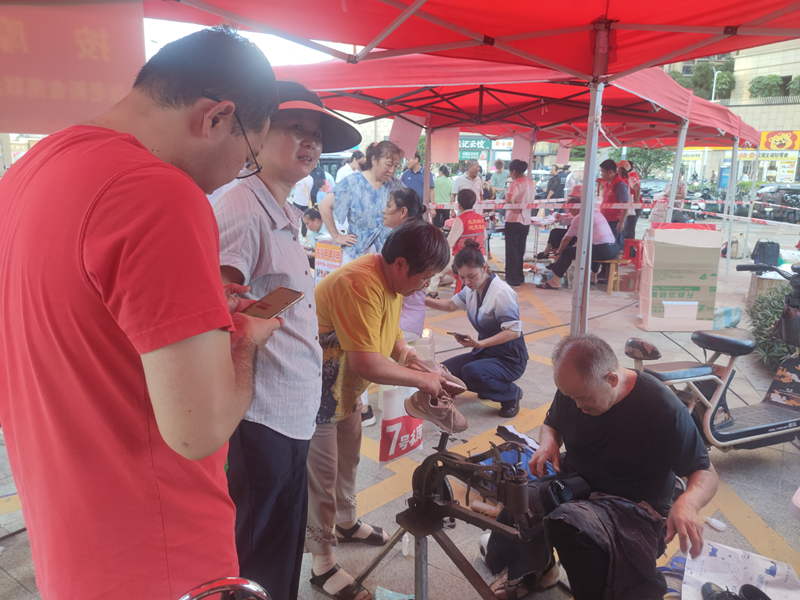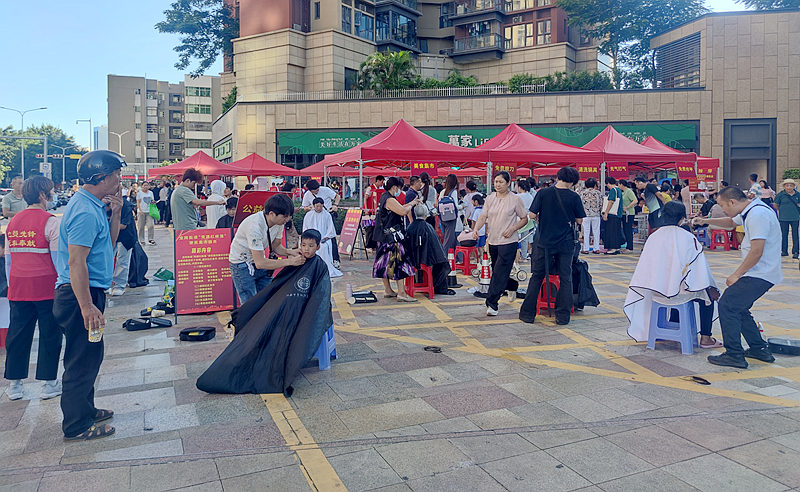 服务内容涵盖政策咨询、健康义诊、生活便民、亲子互动等多个领域。育儿补贴政策解读、反诈知识宣传、流动党员寻访、虚拟社区推广等咨询台前,工作人员耐心答疑解惑;理发、磨刀、补鞋修包、裁衣缝补、美甲、修脚等传统便民项目前排起长队,党员志愿者身穿红马甲,热情服务,细致周到。