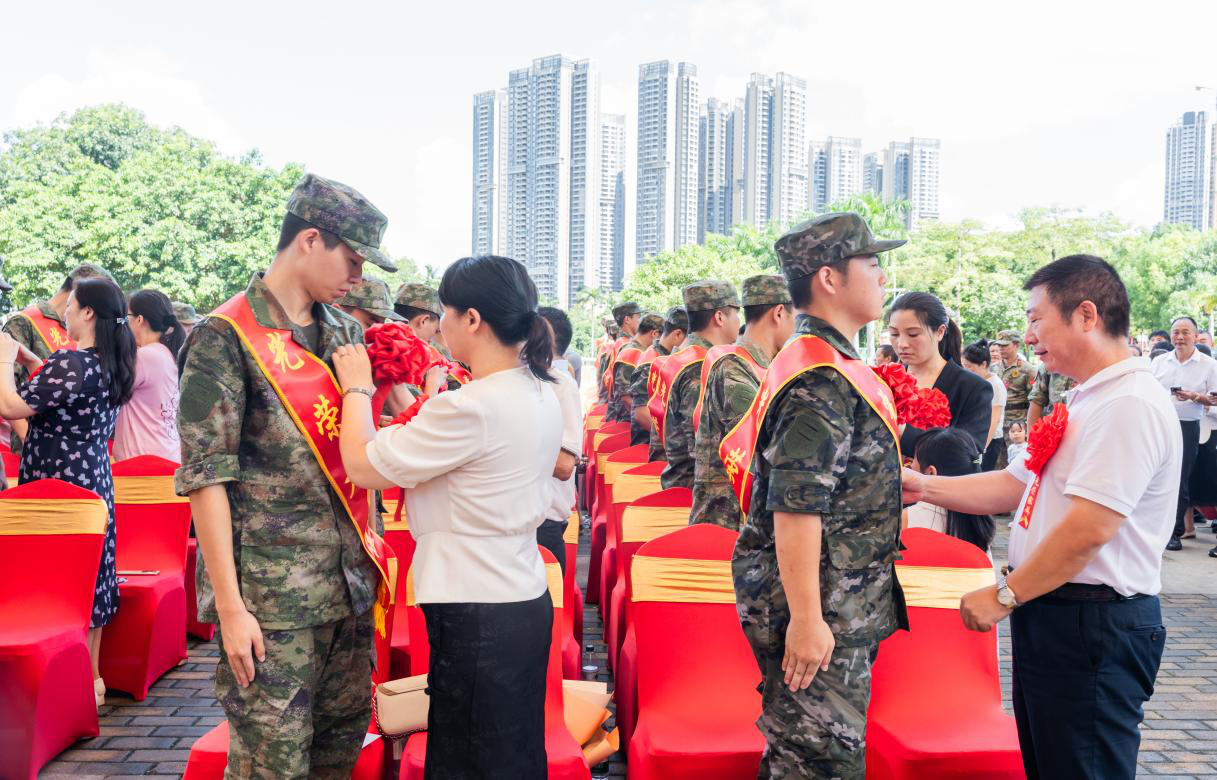 领导及家长为新兵佩戴大红花,将现场的气氛推向高潮,大红花鲜艳夺目,映衬着新兵们朝气蓬勃的面容,彰显着他们即将肩负的神圣使命。