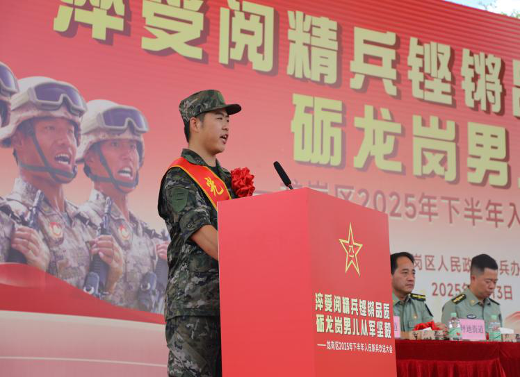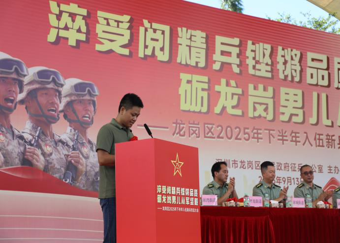会上,区委常委、区人武部主要领导杨华同志宣读了《龙岗区2025年秋季兵员入伍通知》,随后,新兵代表徐承志发表“回忆成长点滴、感恩父母大爱”感言,他表示在家人与社会的滋养下得以成长,朴实话语饱含对亲人的感恩,也彰显报效祖国的决心;另一位新兵代表廖文博上台发言,他以“男儿有志应从军,不畏艰险立功勋,此生不悔入华夏,报效祖国表我心”为主题创作一首诗歌明志,铿锵有力的话语道出了对祖国的赤诚热爱,也表达了自己不畏军营挑战、立志建功军营的壮志豪情。真挚的情感与激昂的诗句引发全场阵阵掌声,也让现场所有人感受到龙岗新兵们保家卫国的赤子之心。