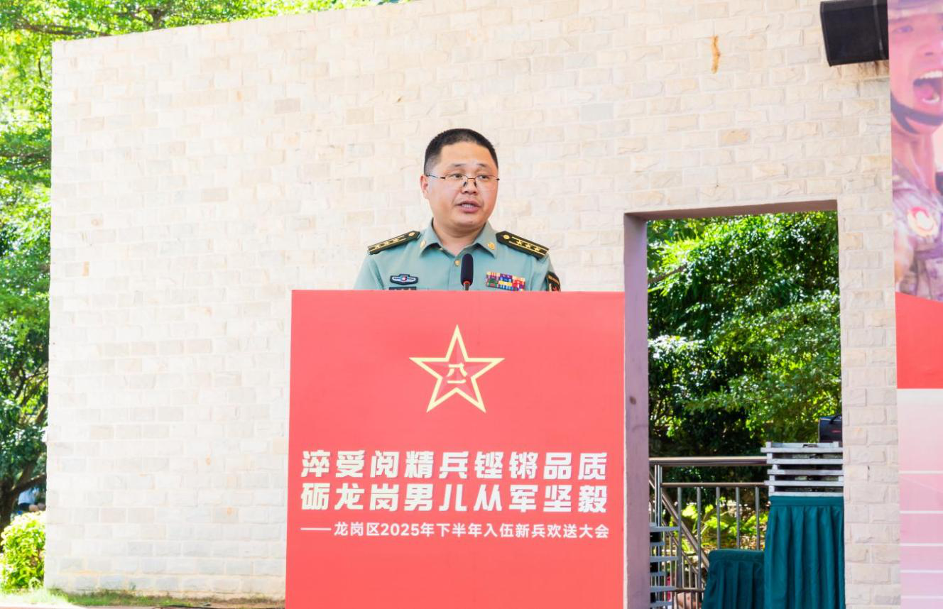 最后,龙岗区人武部主要领导朱洪亮同志以抗战胜利80周年阅兵为例,强调在举世瞩目的盛典背后,受阅军人历经无数次高强度训练,挑战身体与意志的极限,才能在天安门广场以整齐划一的步伐、昂扬的精神风貌接受祖国和人民的检阅。借此勉励新兵们用特区特有士气、龙岗龙马精神去系好军营第一粒扣子,走稳踏实军旅生涯的每一个脚步,以龙岗好男儿的身份在军营绽放热情,回馈祖国及亲人。