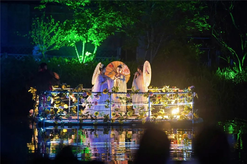 夜幕之下,古村田园化身为没有屋顶的光影艺术馆。升级版夜游不仅推出飞天凤凰、嫦娥奔月、天女散花等光影秀,还结合花船演艺、汉舞表演、非遗打铁花等实景演出,为游客营造出虚实交织的沉浸式夜境。在此漫游,既可赏月观演,亦能徜徉于灯影编织的时空幻景,感受不同于白天的诗意与浪漫。