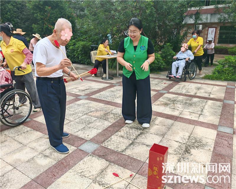走进龙岗区第七人民医院简竹护理院,中秋活动好似一场针对长者精神需求的情感疗愈。在投壶游戏区域,一位年过九旬的老爷爷虽行动上颤颤巍巍,却依旧眼神专注,一次次尝试将箭矢投入壶中。除此之外,制作节日主题风车、书写祝福卡片、合唱经典传统民谣等活动轮番开展。老人们积极参与其中,脸上洋溢着久违的笑容。