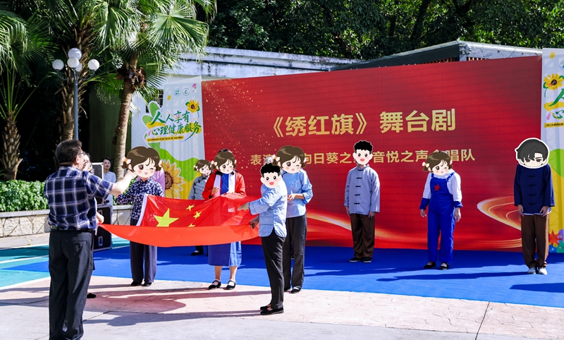 “向日葵之家”康复中心的会员们带来了自编自演的舞台剧《绣红旗》,用真挚的表演传递康复路上的坚持与希望;随后,康复成员与志愿者共同献上合唱《歌声与微笑》及节奏欢快的非洲鼓表演,自信昂扬的风采赢得现场阵阵掌声,展现了心理康复的积极成果。