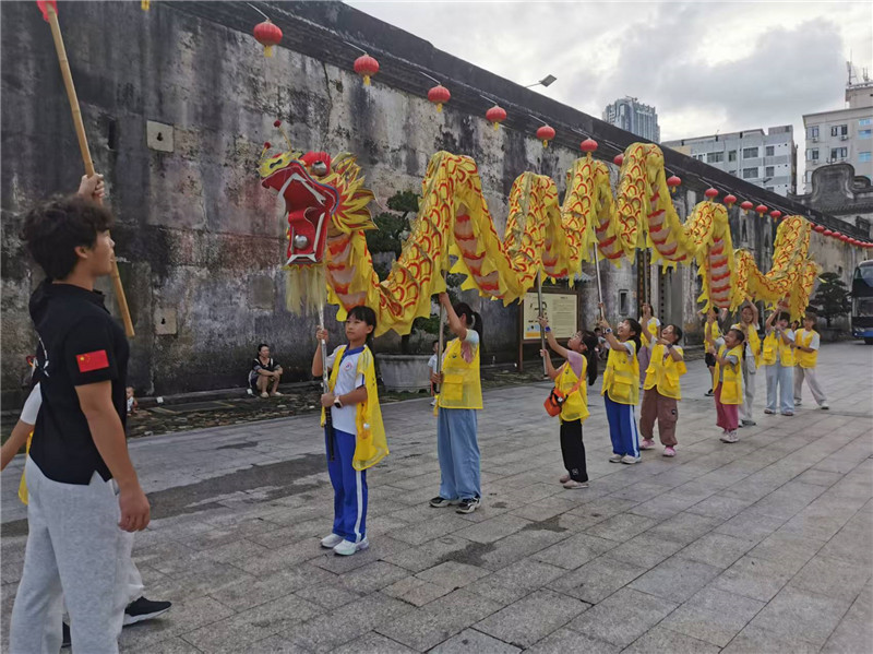 研学最后一站是龙岗客家民俗博物馆(鹤湖新居),省级非遗“龙岗舞龙”的表演让现场气氛达到高潮。学生们分为小组,在传承人带领下学习“8 字绕环”“龙摆尾” 等动作。“舞龙讲究团结,只有大家动作一致,龙才能‘活’起来。”老师说道。同学们还参观了这座百年客家围屋,触摸历史的印记。