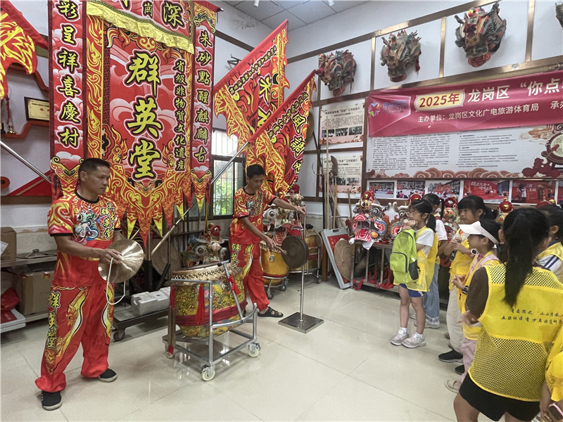研学首站来到朱古石麒麟馆,省级非遗“龙岗朱古石舞麒麟”传承人手持麒麟头模型,向学生们讲述这项技艺的百年传承史。随着锣鼓声响起,老师还演示了经典动作,学生们争相上前,在师傅指导下学习基本套路。“以前只在庙会上见过舞麒麟,今天自己穿上道具才知道,看似简单的摇头摆尾,要练上几个月才能有韵味。” 参与体验学生说。