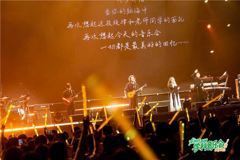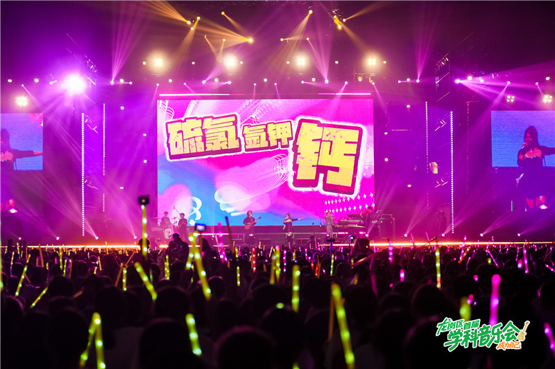 紧接着,触耳先生乐团接连献上《物态变化》《光的折射》《元素周期表》《生物与生物圈》等原创学科金曲。从物理现象到化学元素,从地理风貌到历史脉络,枯燥的知识点在电吉他、鼓点与旋律的碰撞中“活”了起来。台下学生挥舞荧光棒,跟着节奏齐声跟唱,俨然一场大型学科演唱会。