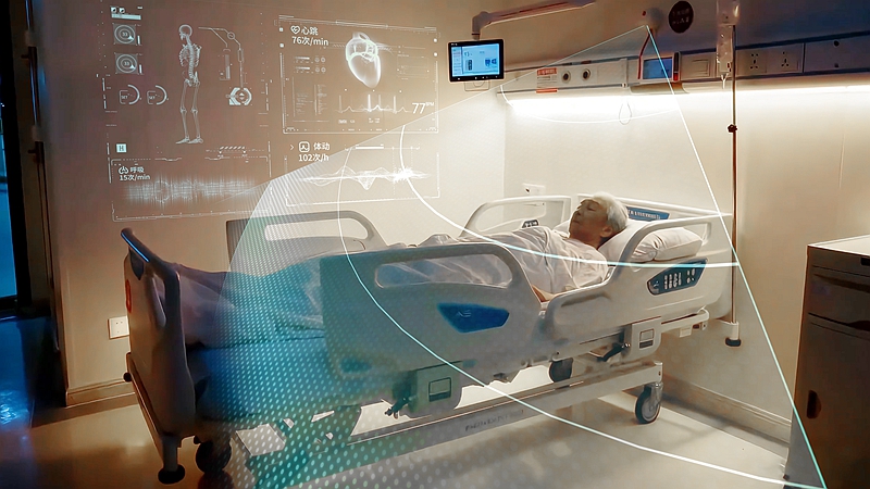 患者端:除了床头“暖屏”提供的护理计划查询、检验检查结果查询与人工智能辅助报告解读、人工智能陪聊解闷等,医院还配置生命体征探测雷达,可无接触监测心率、血压等数据;卫生间的防跌倒雷达24小时值守,一旦发生摔倒风险,值班护士会第一时间收到报警,实现“隐形守护”。