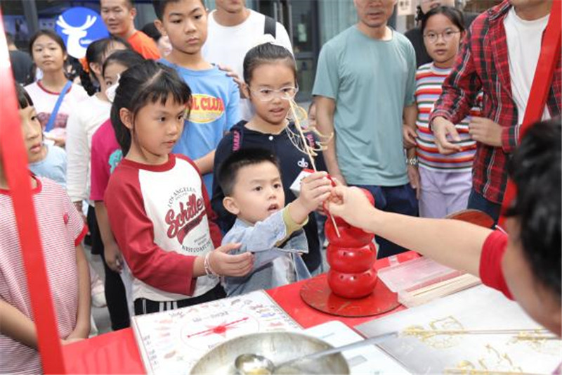 除了趣味游戏,“即影即得”与非遗糖画两大特色环节为活动注入浓厚文化气息,成为17个社区的“人气焦点”。“即影即得”摊位前,居民们三五成群合影留念,全家同框、邻里结伴,镜头下的灿烂笑容被定格,成为邻里相聚的珍贵纪念。非遗糖画摊位前始终排起长队,传统技艺的魅力在邻里互动中代代相传。