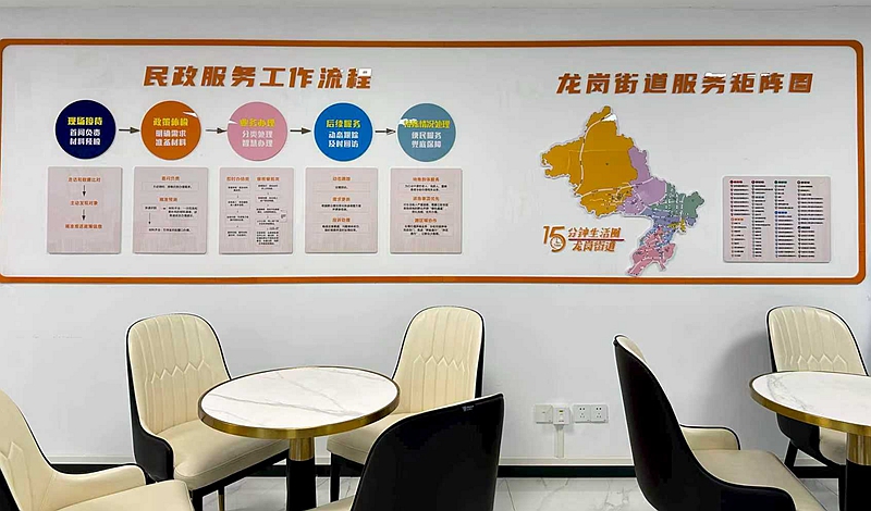 龙岗街道民政服务站坐落于人流量密集的党群服务中心(年流量超10万人次),将民政服务功能有机“嵌入”居民日常活动的“城市客厅”,打破传统服务场所的界限。居民由以往“专程找”变为现在“顺路办”,大大降低了办事的心理与时间成本,也让“服务型政府”理念在空间布局中生动体现。