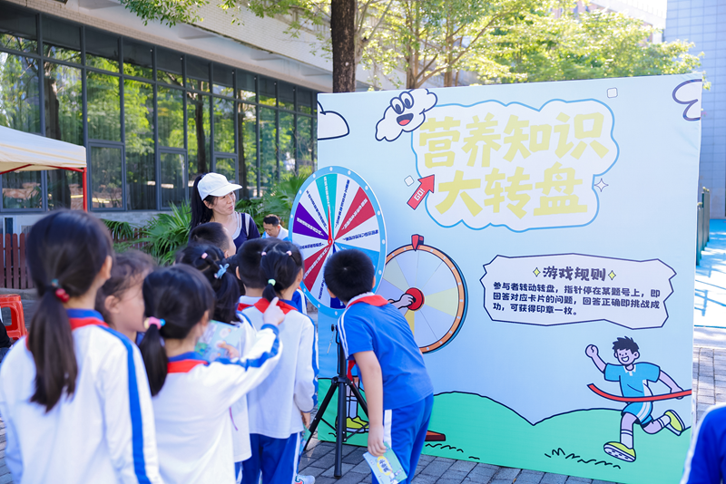 结营当日的科普游园活动,成为孩子们沉浸式学习健康知识的“快乐课堂”。四大趣味游戏区前热闹非凡,孩子们在动手实践中解锁体重管理密码:在“健康征程”洞察甜机区,大家小心翼翼地用镊子夹起方糖,通过电子秤称量与指定饮料含糖量相等的方糖,当得知一瓶常见果汁饮料竟对应多块方糖时,不少孩子皱着眉头说“以后要少喝甜饮料”;“我的‘健康餐盘’”游戏前,孩子们对照膳食比例,将蛋白质、膳食纤维、碳水化合物的食物模型一一摆进餐盘,306班的张同学边摆边念叨“要像老师说的那样,蔬菜多一点,肉和饭搭配好”;“竿钓卡路里”区,孩子们手持鱼竿钓起印着食物与热量的卡片,大声读出“一块蛋糕需要跳绳30分钟才能消耗”,在互动中直观理解“吃动平衡”的意义;营养知识大转盘前,转动指针、抢答健康问题的声音此起彼伏,答对的孩子拿着印章贴纸,脸上满是成就感。“游戏比看书有意思多了,我记住了好多健康知识!”参与活动的刘同学说。