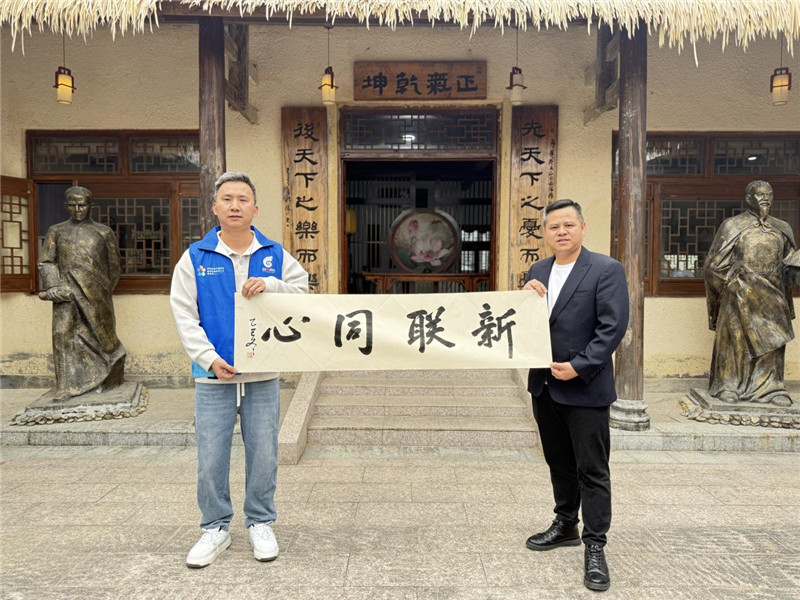 随后,坪地新联会与深汕新联会开展联谊座谈。坪地新联会常务副会长聂宗树及深汕新联会常务理事钟德久分别介绍了各自组织的发展情况与特色工作,并就如何发挥新的社会阶层人士作用展开深入讨论。在座谈尾声,坪地新联会理事欧俊强现场挥毫泼墨,写下“新联同心”四个大字,象征着两地新联会同心同德、携手共进的深厚情谊。