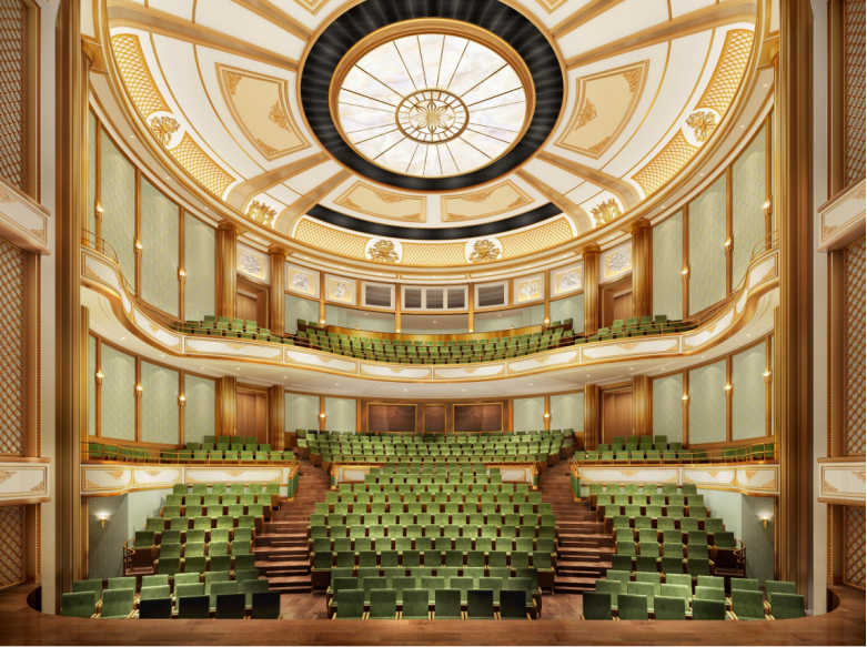 戏剧厅采用镜框式舞台,配置鼓筒转台(内置升降台)与台口前乐池升降台;平面布置为“主舞台+左侧台+右侧台”的三向组织,满足戏剧、舞剧、小编制交响/合唱及综艺晚会等多类型演出对快速转场与复合景别的需求。