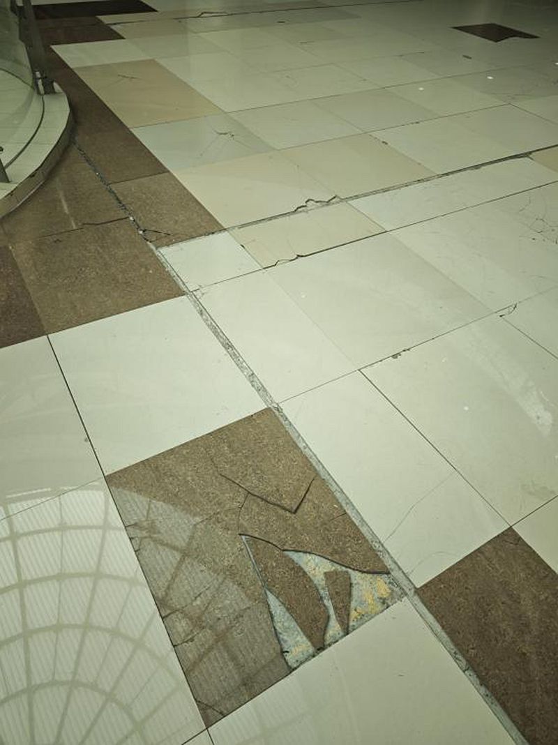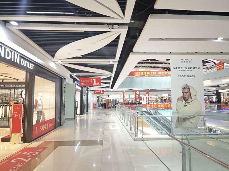 进入旁边的大型商场后,反差更加明显。一至三层仍有不少商户正常经营,货架上摆满各类商品,但商场四五层则呈现大面积空置状态。记者逐层探访发现,四五层的商铺大多大门紧锁,玻璃门贴上了褪色的招商广告,门口残留着废弃纸箱和杂物。同时,设施老化的痕迹随处可见:多处地砖出现裂缝、边角破损,中间的玻璃围挡有明显裂痕,未及时更换修补,存在不小的安全隐患。