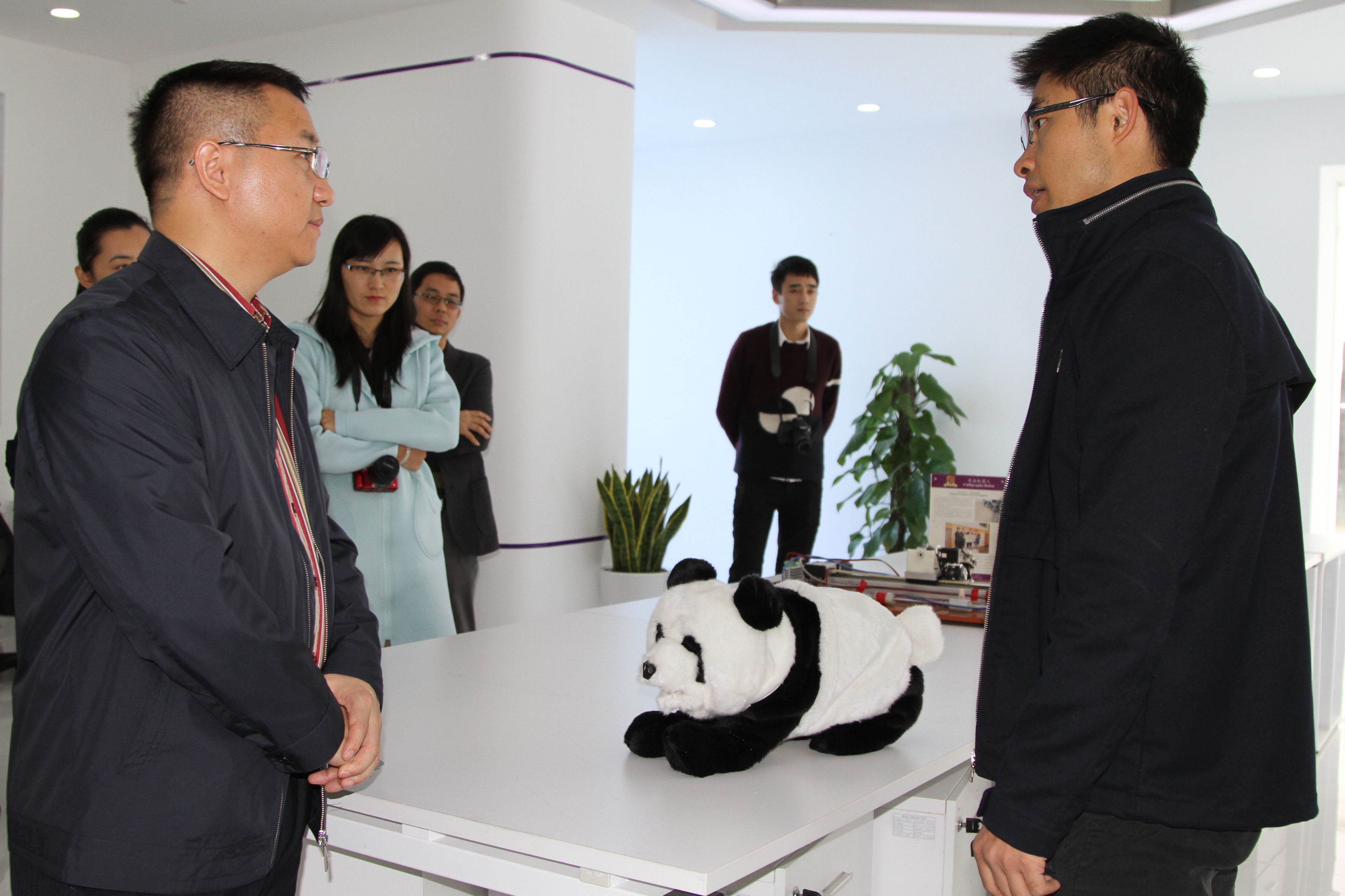 在花生U谷创意文化产业园,曾宪旺详细参观、了解了产业园的建设与企业进驻情况,仔细询问了产业园在运营过程中存在的困难和问题。在大运软件小镇,一头毛茸茸的熊猫机器人的人机对话引起了大家的兴趣。该机器人名称为智能交互式熊猫机器人,由香港中文大学(深圳)徐扬生博士团队负责研发,通过让熊猫机器人与老年人互动交流,达到减缓记忆退化的功效。该机器人能反馈12种声音,而且还有点小脾气,你抚摸熊猫的头,它就开心摇头摆尾;你摸它的屁股,它就不开心。曾宪旺饶有兴趣地与熊猫机器人进行互动,并详细了解了香港中文大学(深圳)机器人与智能制造研究院的新近研究成果及投产情况。