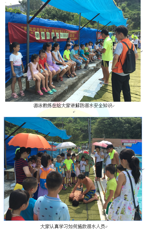 活动当天,天气炎热,但小朋友们坐在遮阳棚下依然能集中注意力认真听教练讲防溺水安全知识,随后教练现场演示溺水后应该怎么做,以及如何施救溺水人员等,现场的小朋友们都认真观察学习。尽管时间不长,但相信他们在参加完这次的防溺水知识培训之后,在以后遇到溺水情况时,懂得怎么去保护自己和他人。