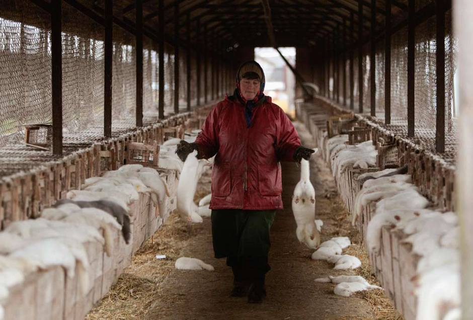 许多动物并不是人工生育的,而是野生捕获的。它们不但要忍受被囚禁的生活还要忍受糟糕的卫生状况。6年前,在伏尔加格勒,一家皮草厂因为经济危机饿死过多达1万6千只貂。今天,即使有大量的人在抗议皮草贸易,但似乎仍然没有撼动皮草加工厂的经济地位。图为在白俄罗斯一家皮草长,工人在给动物打药。这种药可以让动物丧失行动反抗能力,但是直到死前都会保持清醒。