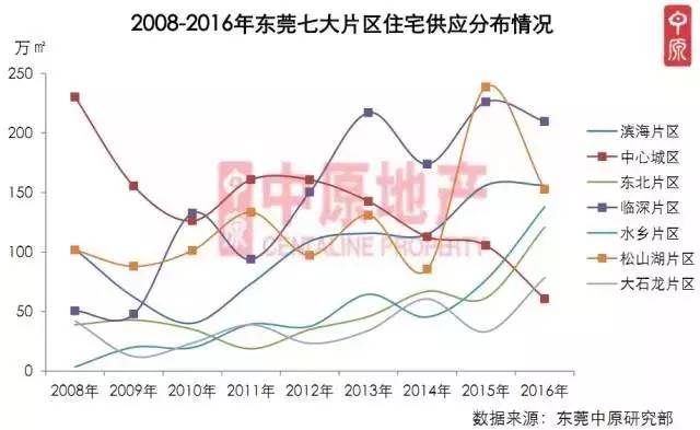 2016年临深片区依然是市场供应主力军,而中心城区供应量最小,仅60.64万㎡。2016年中心城区供应创下2006年以来新低,供应严重紧缺。此外, 松湖、临深片区的供应量同比降幅也比较大,分别为36.02%、7.25%。
