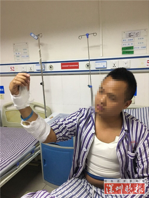 谢先生的妻子表示,她跑过来见到丈夫躺在浴室内,地面全是血,便赶紧拨打酒店前台电话,但无人接听,她又跑下楼喊来了酒店前台人员。赶来的前台人员也立即叫来了酒店客服经理,随后,酒店人员拨打了120电话,谢先生被送到了附近的深圳健安医院接受治疗。经过医院检查,谢先生的右手被玻璃划伤,缝了14针,屁股上由于扎了很多玻璃渣,取出来后又缝针,右耳下方也有伤口,右侧肋骨撕裂受伤。谢先生的妻子说,谢先生在医院做了2个多小时的手术,全身被缝了近200针。