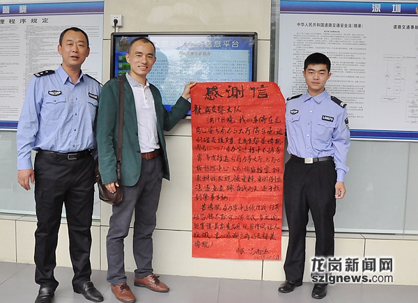 市民冯先生给龙岗交警黄博聪(右)送来感谢信