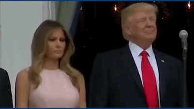 在活动中的奏国歌环节,特朗普忘了右手抚在左胸上表示效忠,东欧移民出身的第一夫人提醒了他。