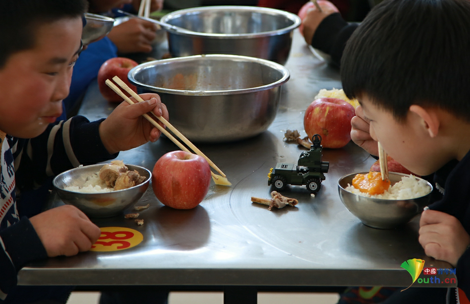 图为统部寄宿制学校学生食堂的午饭餐桌。中国青年网记者孙钊摄