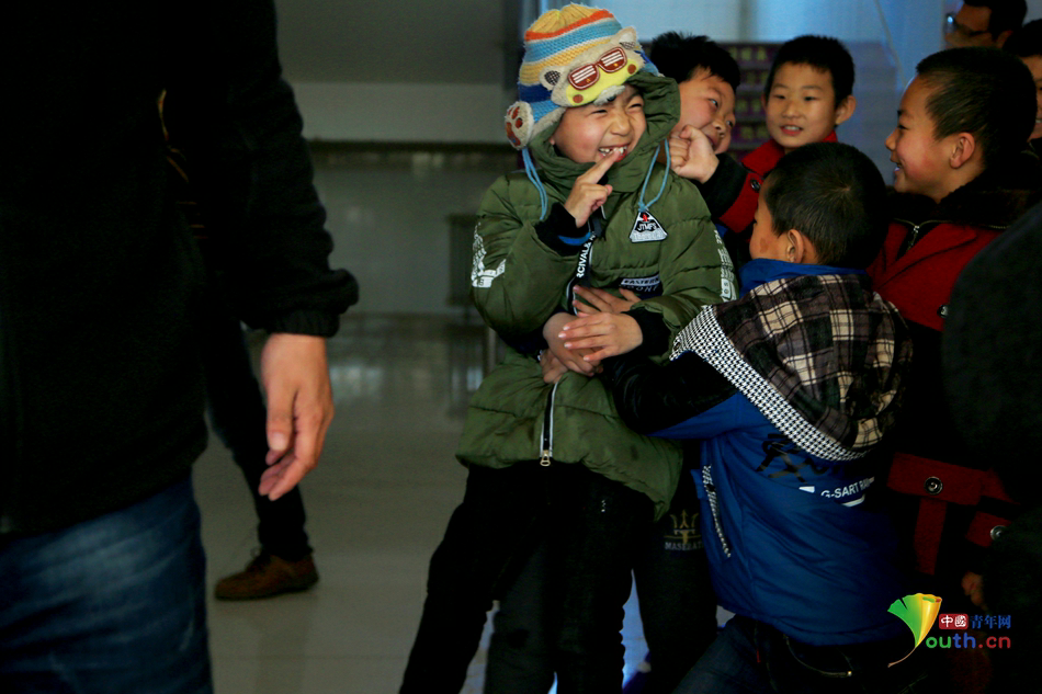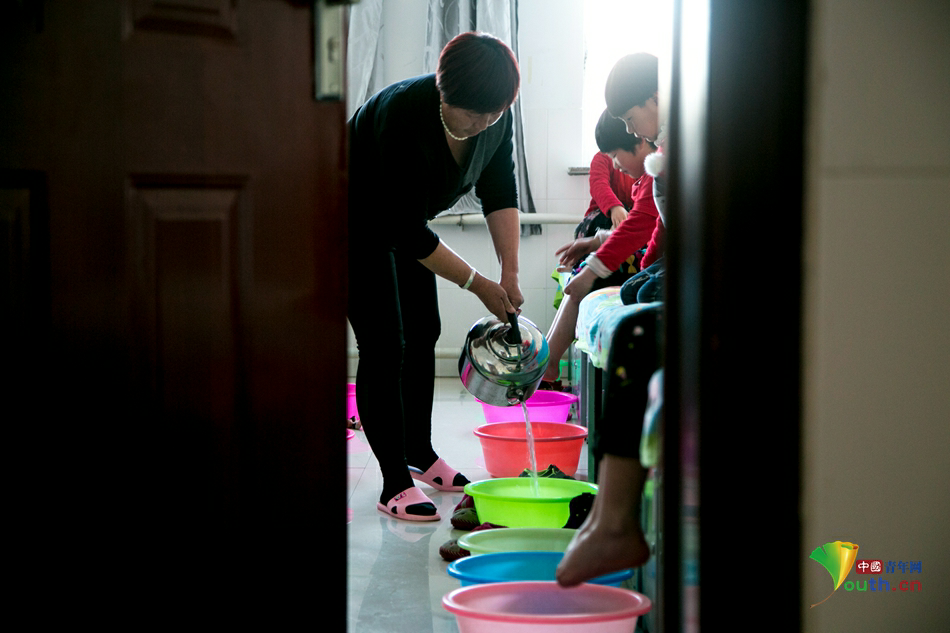 “曾经每个宿舍都用上下床连成的两层大通铺,孩子们一个紧挨一个,几乎没有活动空间。常常是一个孩子夜间上厕所,整个宿舍的人都被弄醒。而且,宿舍里还有股浓重的汗泥味儿。”每当回忆起第一次去宿舍夜查时所见到的情景,李占臣表示十分心疼。图为宿管阿姨高凤霞给低年级的孩子们倒水洗脚。中国青年网记者孙钊摄