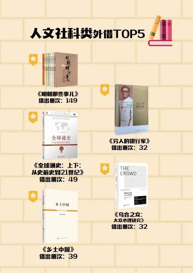 在人文社科类书籍榜单中,前两名都是历史类书籍。其他分别有地理学、心理学类的书籍。而榜首《明朝那些事儿》的借阅量远远超过其他书籍,看来大家对历史的兴趣十分浓厚噢~