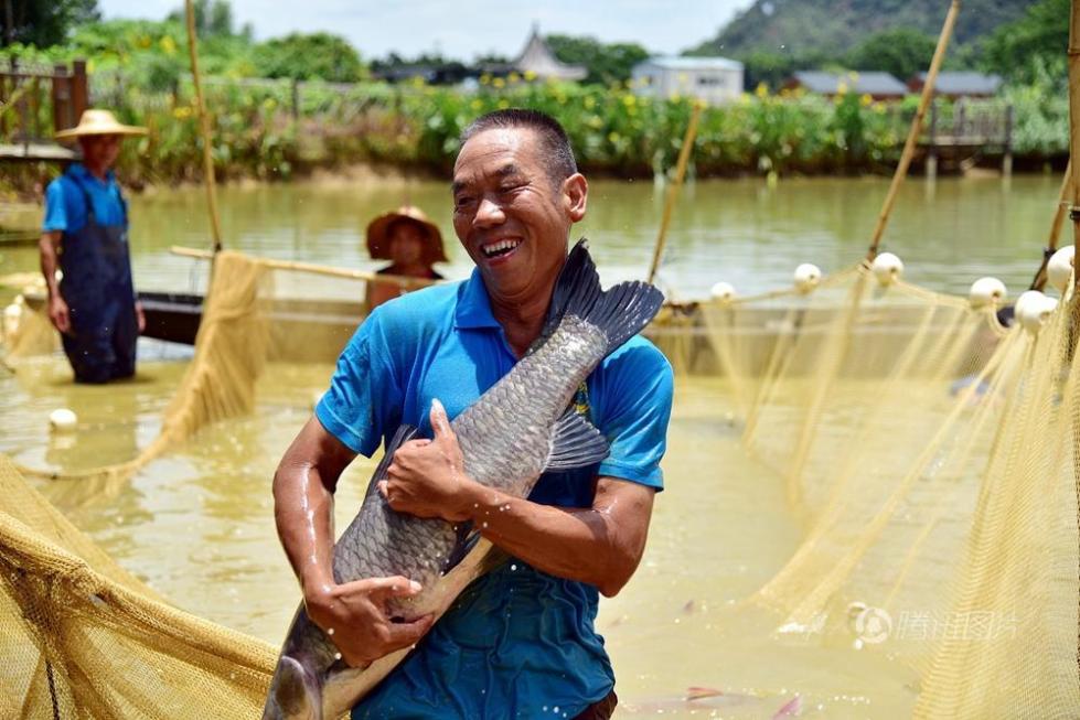 广东佛山捕鱼现场 壮汉抱大鱼如同抱娃