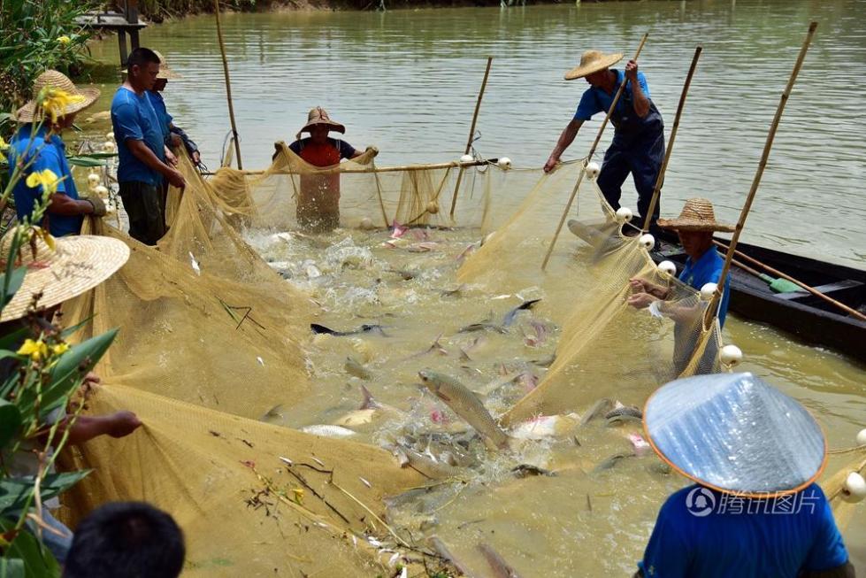 广东佛山捕鱼现场 壮汉抱大鱼如同抱娃