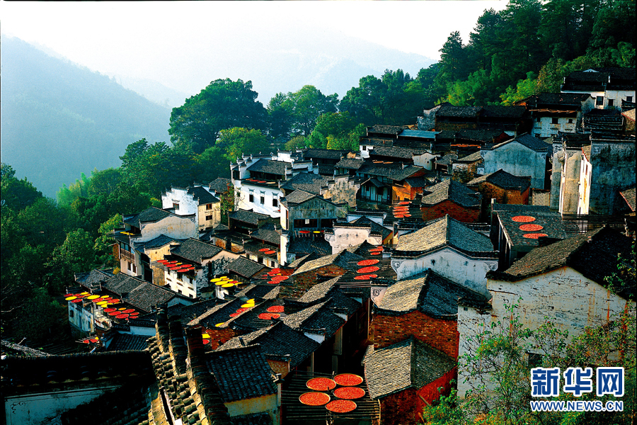 初秋时节,薄雾袅袅,晒秋和红枫点缀在徽派民居之中,独具东方美韵。
