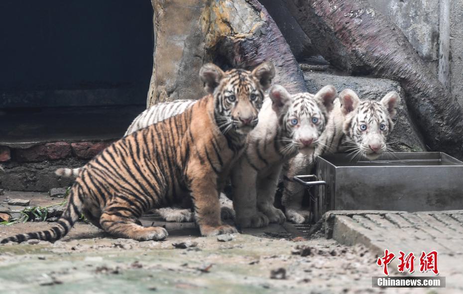 9月6日,在济南动物园诞生的孟加拉虎三胞胎迎来“百日”,三只虎宝宝在虎妈妈的呵护下与游人见面。据悉,父母都是孟加拉虎,一胎产下两种毛色三胞胎虎仔实属罕见。中新社记者 张勇 摄