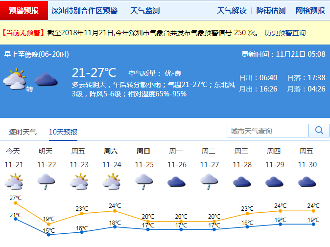 市气象局预计,20日17-20时,深圳市以多云天气为主;气温在22-25℃;相对湿度65%-85%;偏北风3-4级,阵风5-6级;全市能见度大部分地区在10公里以上。傍晚天气舒适,适合户外运动。21日夜间至22日冷空气影响,有小雨,北风加大,沿海和高地最大阵风7-8级,22日最低气温会降至15℃左右;23-24日晴天间多云,气温回升;25-26日,阴天有阵雨。