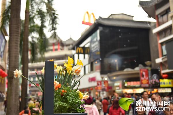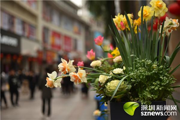 东门步行街盛开的花卉盆栽向过路的人们迎风起舞。↑